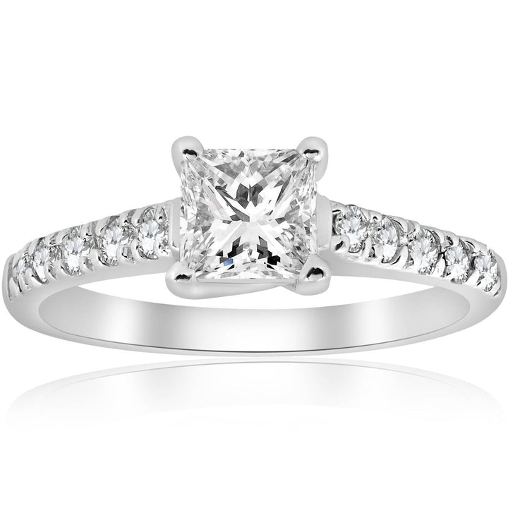 This 1 1/4ct Vintage Princess Cut Diamond Engagement Ring by Pompeii3 captures timeless romance with a classic princess-cut center stone surrounded by accent diamonds, evoking vintage charm and elegance.
