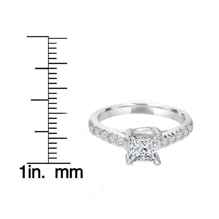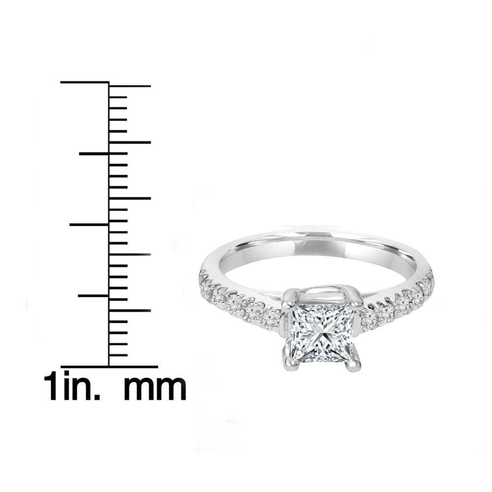 Handcrafted in solid 14k white gold, featuring a 1ct clarity-enhanced princess cut diamond and 10 round brilliant cut natural diamonds. Prong set.