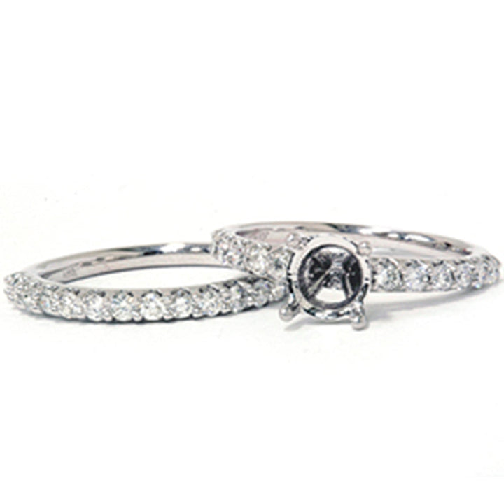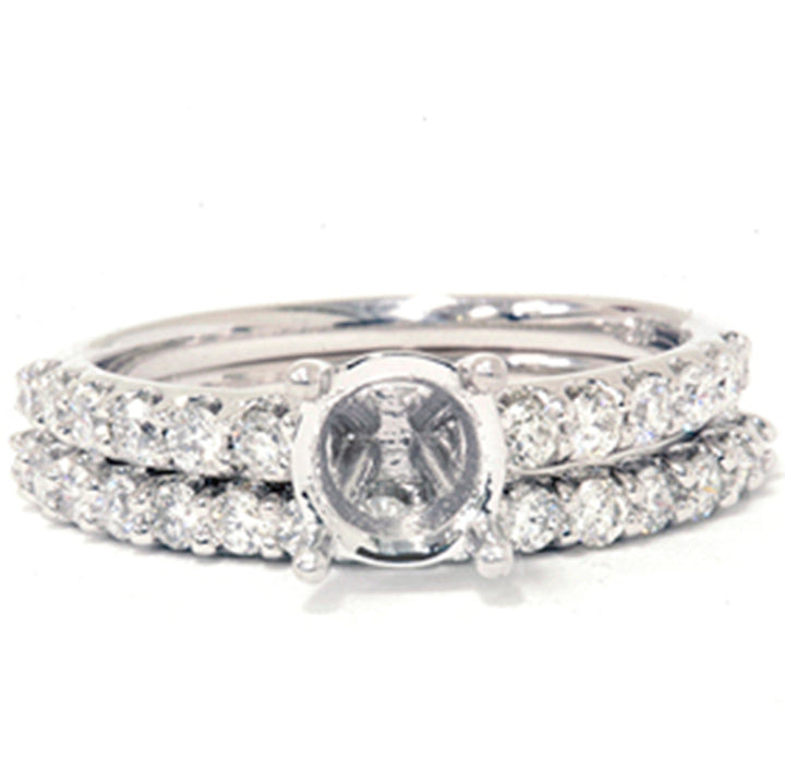 Handcrafted in 14k white gold with 3/4ct total of round brilliant cut natural diamonds. Mounting ready to hold 5.7-6.7mm round stone.