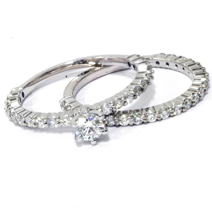 This 1ct Diamond Engagement Wedding Ring Set by Pompeii3 is a complete expression of love and commitment. Featuring a 1/4ct center diamond surrounded by 43 round-cut diamonds, this set is crafted for lifelong elegance.