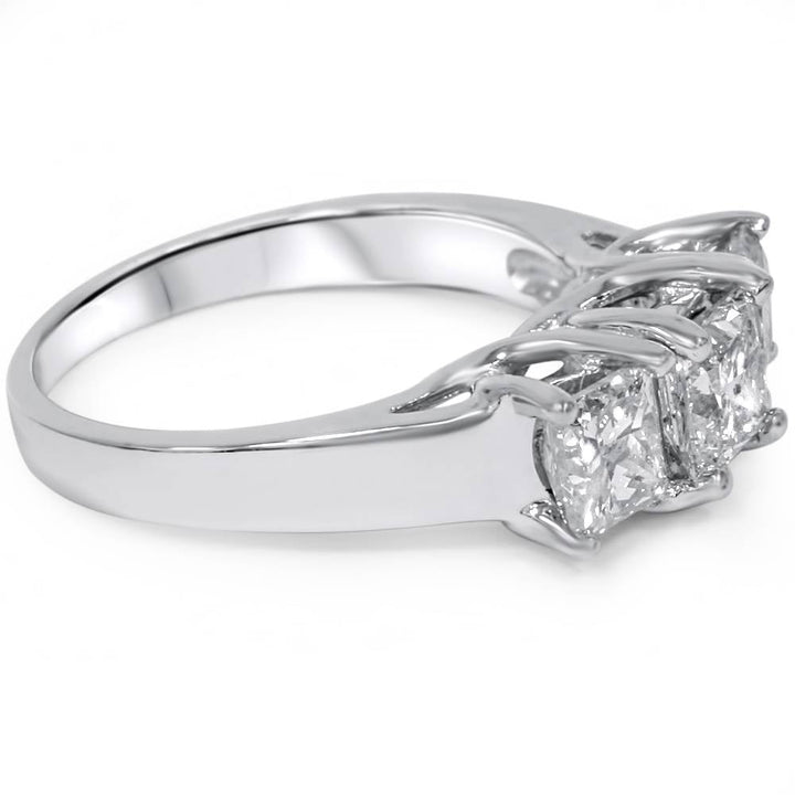 Solid 14K white gold with three princess square cut lab-grown diamonds (G-H color, VS clarity), totaling 2ct. Prong-set.