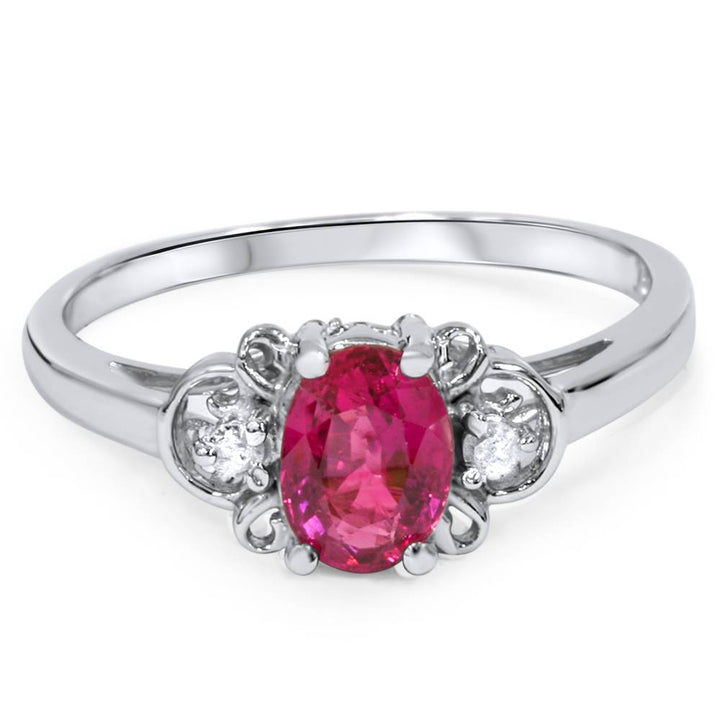 This 5/8ct Ruby & Diamond Ring by Pompeii3 features a .60ct oval ruby and two round brilliant-cut natural diamonds, set in solid 14K white gold. This stunning ring combines the vibrant red of the ruby with the sparkling brilliance of diamonds, creating a perfect balance of color and shine.