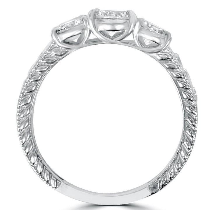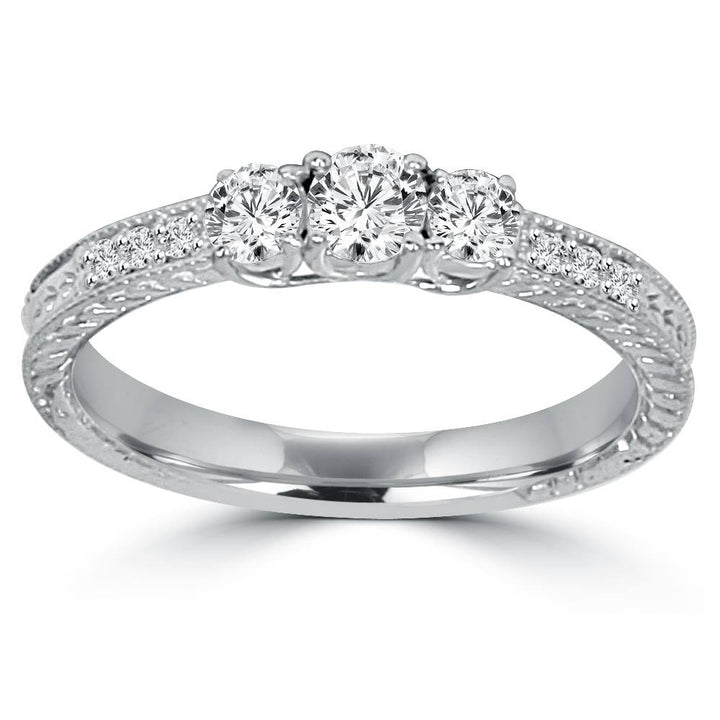 This 1ct Vintage Three Stone Round Diamond Engagement Ring by Pompeii3 reflects timeless romance with vintage-inspired details. A stunning 3/8ct center stone is flanked by two 1/5ct side stones, with additional petite diamonds along the shank that enhance its old-world elegance. Perfect for those who appreciate history and lasting love embodied in jewelry.