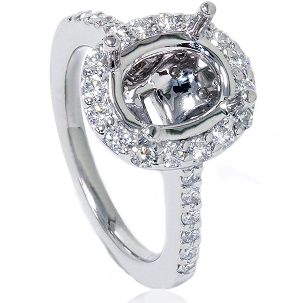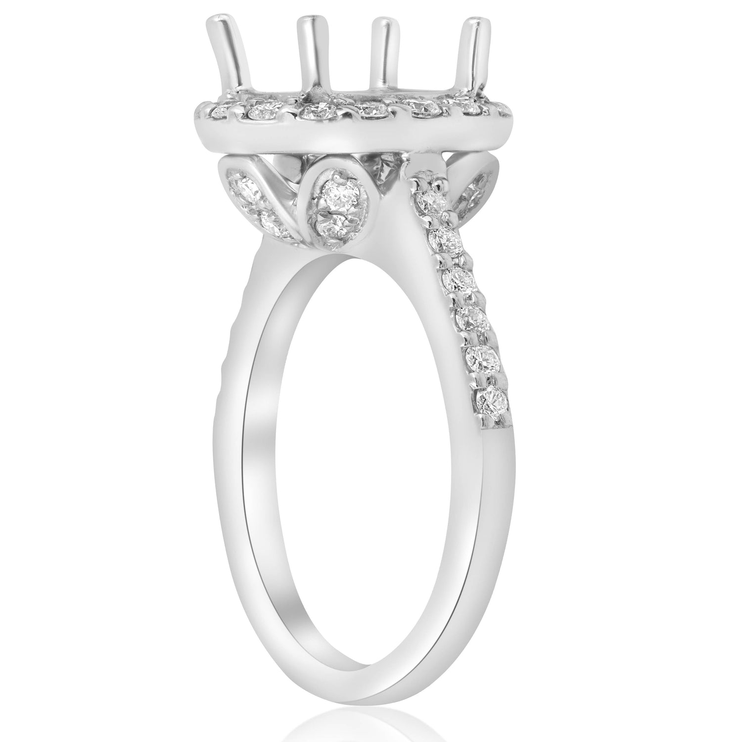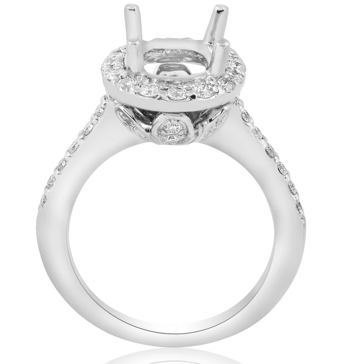 Crafted in solid 14k white gold with 30 round brilliant cut natural diamonds totaling 3/4ct. Fits a 10x8mm oval stone. Diamond clarity: I2-I3; color: H-I.