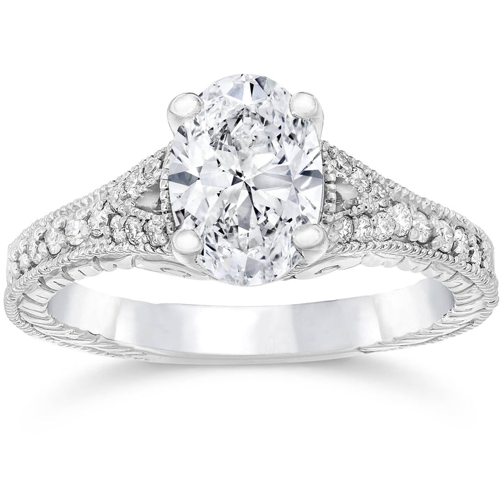 This 1 1/4ct Oval Diamond Vintage Engagement Ring by Pompeii3 features a stunning oval diamond surrounded by 22 round-cut natural diamonds, set in solid 14K white gold. The vintage-inspired design provides an elegant and sophisticated look, making this ring the perfect choice for those who appreciate classic beauty with modern flair.