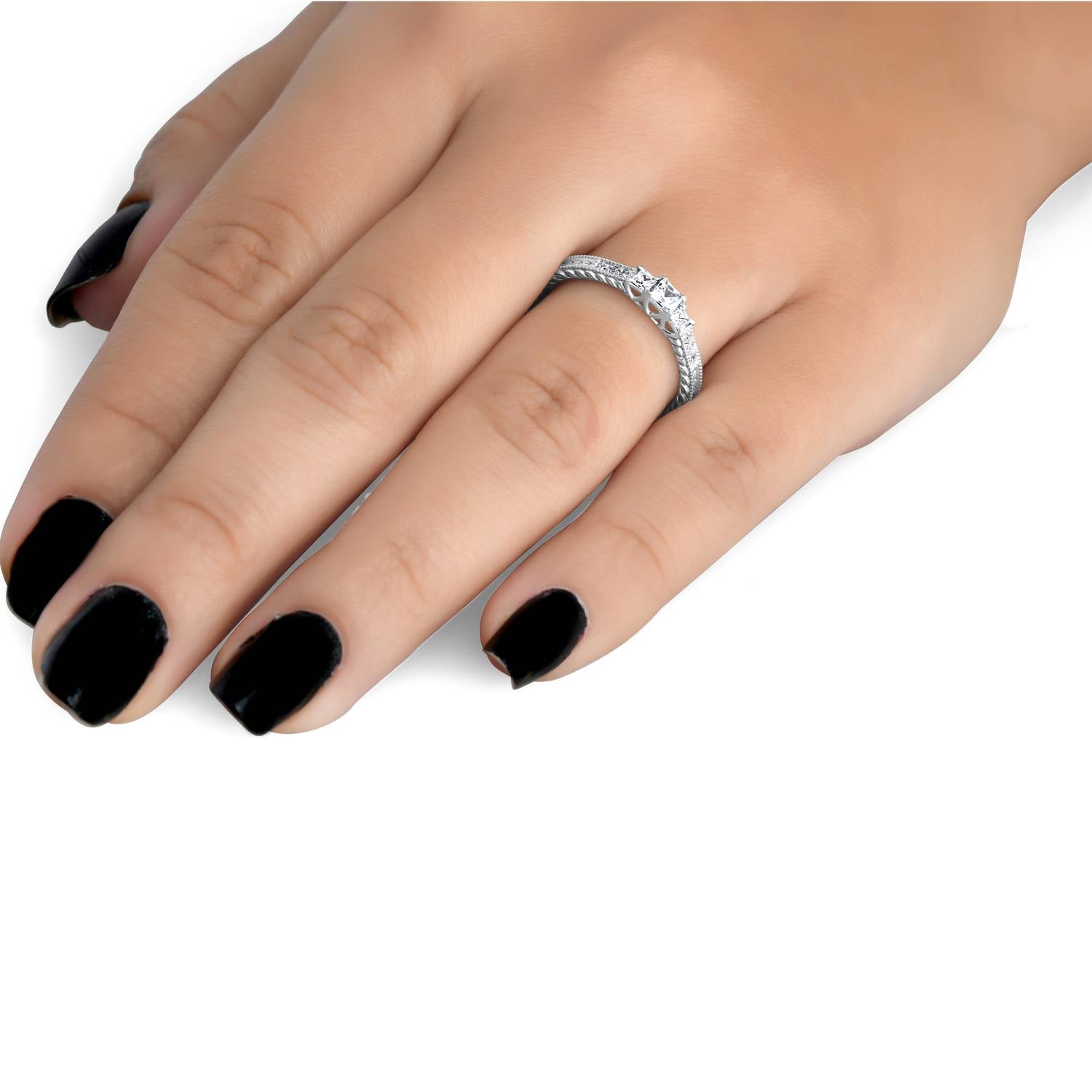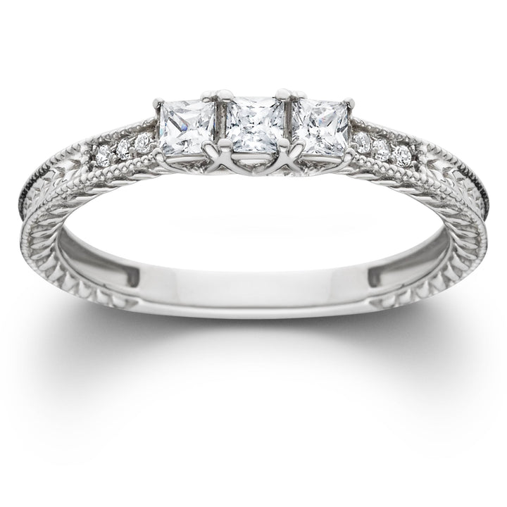 This 1/4ct Vintage Three Stone Princess Cut Diamond Engagement Ring by Pompeii3 exudes antique elegance with petite diamonds and detailed craftsmanship — a charming nod to tradition.