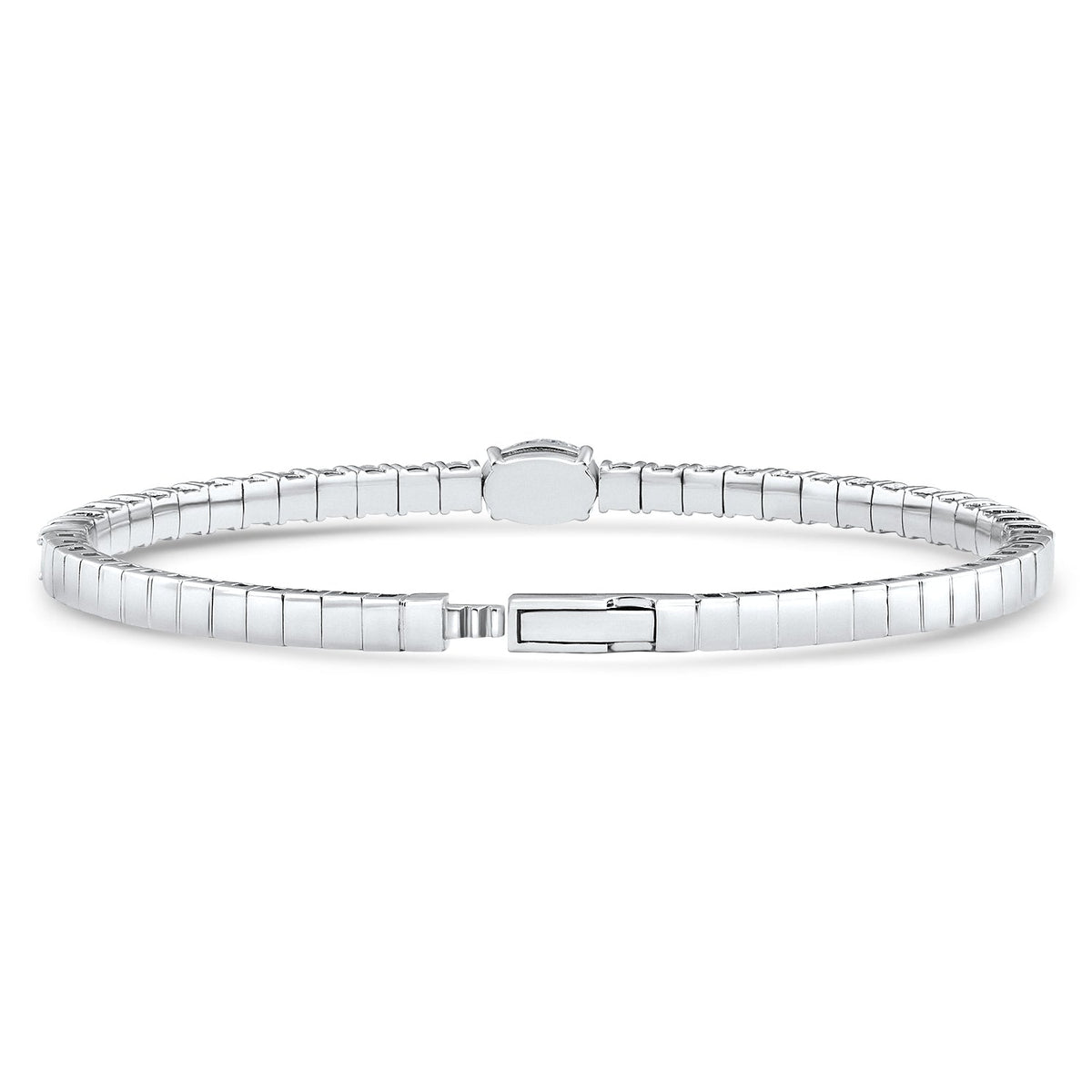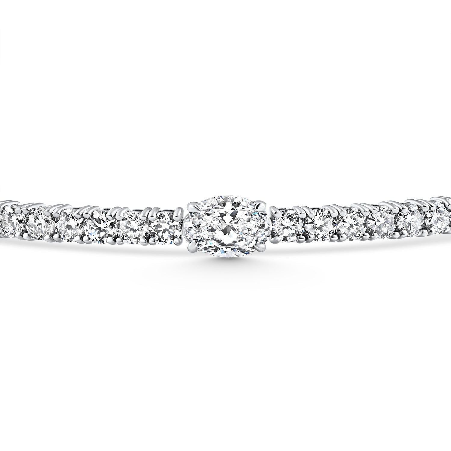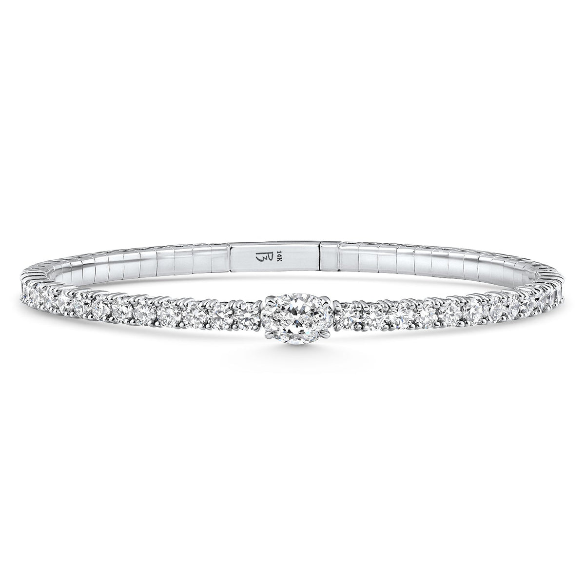 Crafted in solid 14k white gold with 28 round brilliant cut lab-grown diamonds and a 1ct large oval lab-grown diamond, set in a polished flexible bracelet.