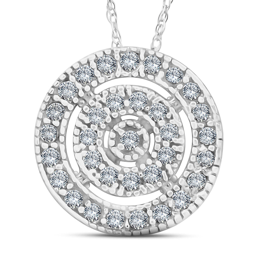 This 3/8ct Filigree Pave Circle Antique Pendant by Pompeii3 features vintage-inspired elegance with 33 shimmering diamonds in an intricate filigree design, perfect for timeless sophistication.
