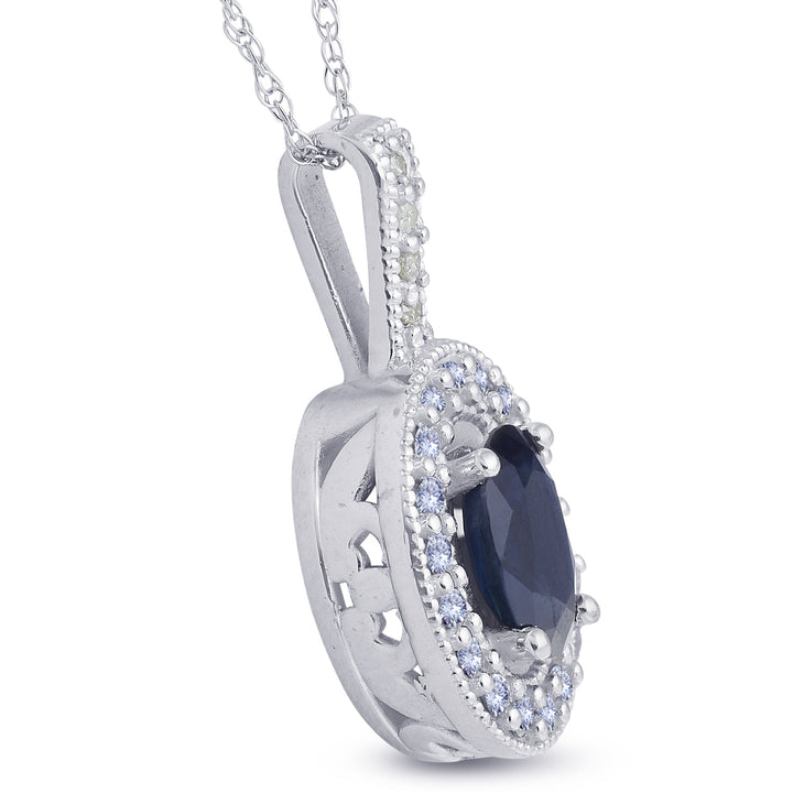 Handcrafted in 14k white gold with a 7x5mm oval blue sapphire and 22 round diamonds. Includes 18' 14k white gold clasp lock chain.