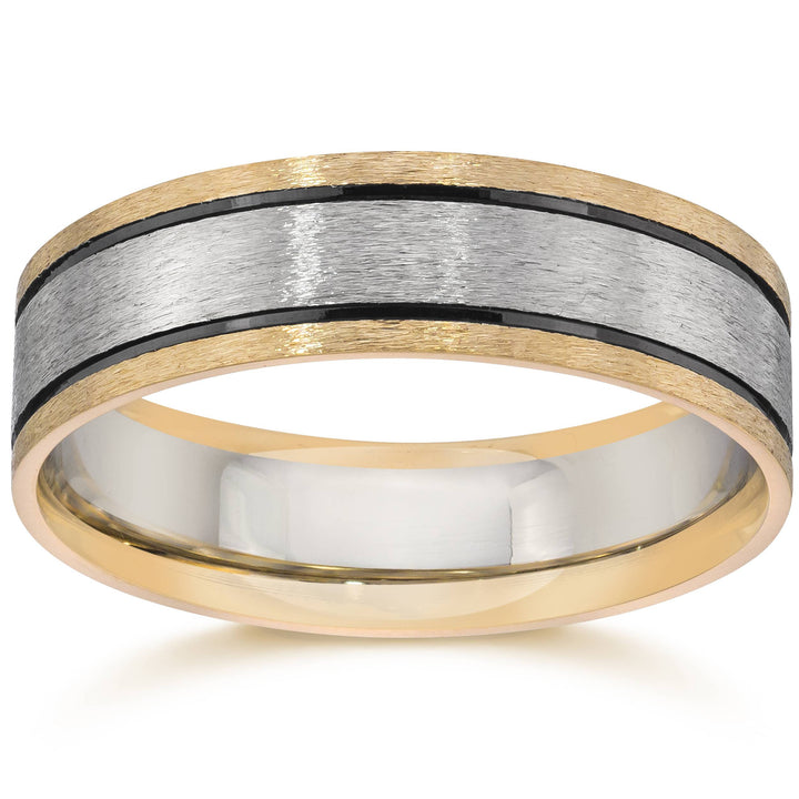 This Double Inlay Brushed Wedding Band in 14K White & Yellow Gold by Pompeii3 is a modern and stylish men’s wedding band. The two-tone design features solid 14K white and yellow gold, with a double inlay of black gold that adds an edgy and contemporary twist to the traditional wedding band. The brushed finish provides an elegant texture, making this piece a unique symbol of love and commitment.