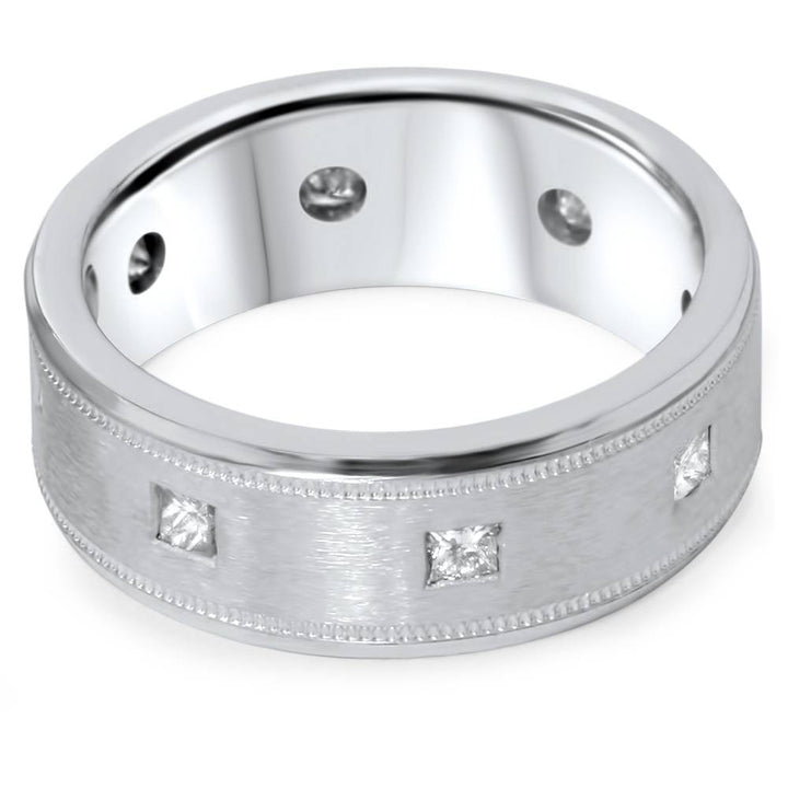 This 3/4ct Princess Cut Diamond Comfort Fit Wedding Ring by Pompeii3 is a timeless and elegant piece. Featuring eight princess-cut natural diamonds, each bezel-set in solid 14K white gold, this ring offers a sleek and comfortable fit. Perfect for those who appreciate classic, understated luxury, this ring is a beautiful symbol of commitment.