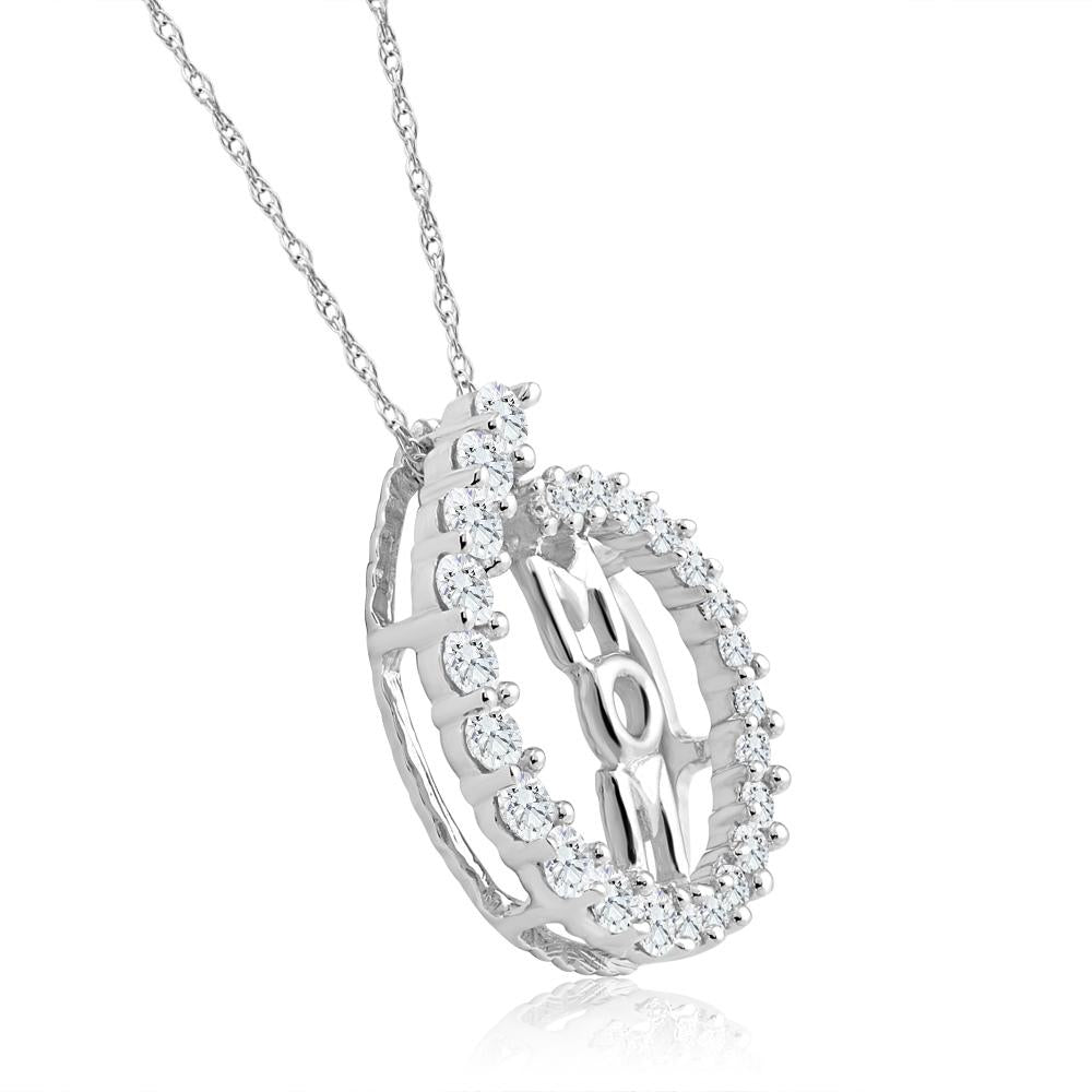 Crafted in solid 10k white gold with 26 round brilliant cut natural diamonds totaling 3/4ct. Pendant measures 3/4' tall and includes an 18' 10k white gold clasp lock chain.