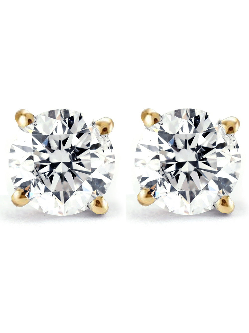 Crafted in solid 10k white or yellow gold with two round brilliant cut genuine diamonds (I2-I3 clarity), totaling 1.00 carat. Secured with gold push backs.