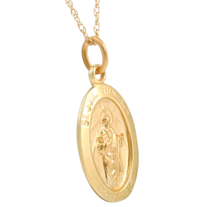 Crafted in solid 14K yellow gold. Features the St. Jude Thaddeus medal pendant. Includes an 18' 14K gold thin chain.