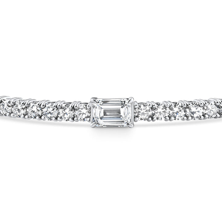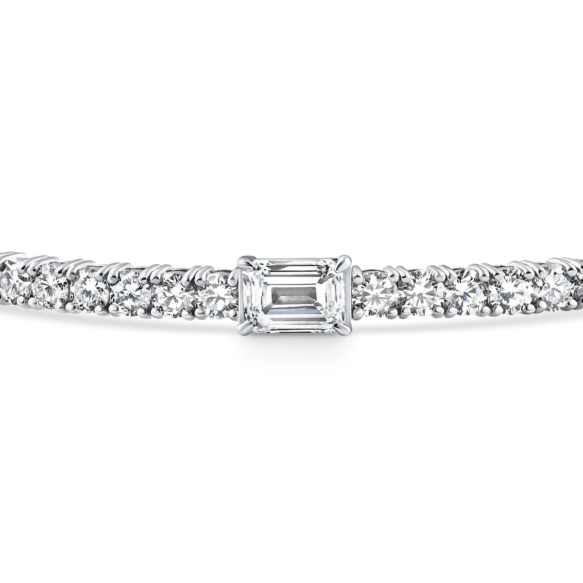 Crafted in solid 14k gold with 28 round brilliant cut lab-grown diamonds and a 1 1/5ct emerald cut lab-grown diamond. Flexible, hand-assembled bracelet.