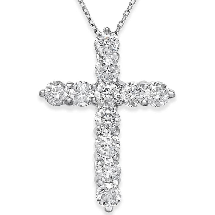 This 2 1/4cttw 14k White Gold Real Diamond Cross Pendant by Pompeii3 is a symbol of faith and elegance. Featuring 11 round brilliant-cut natural diamonds, this cross pendant is prong-set in solid 14k white gold and comes with an 18' chain for secure wearing.