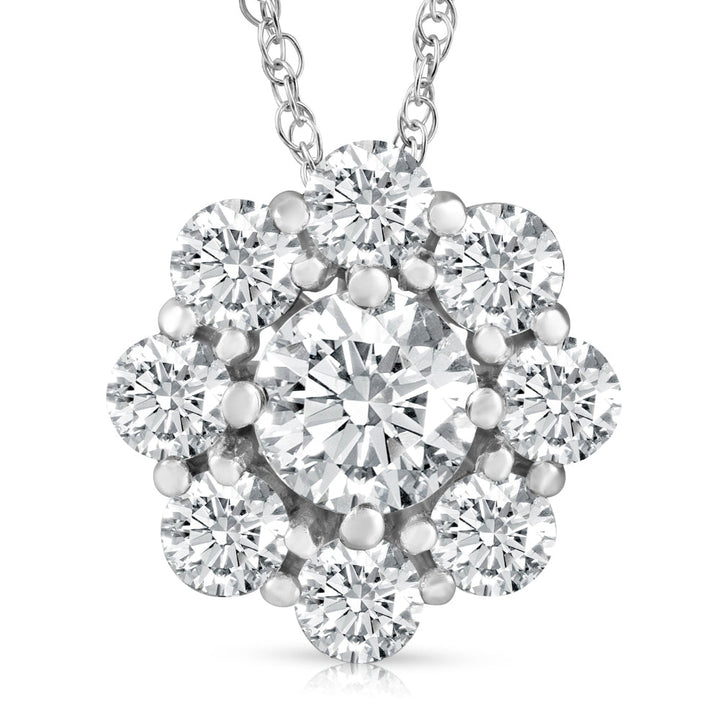 Crafted in 14k white gold with a 1ct round brilliant cut lab-grown diamond and 8 additional round lab-grown accent diamonds (I2-I3 clarity, F-G color). Includes an 18' chain with spring ring lock.