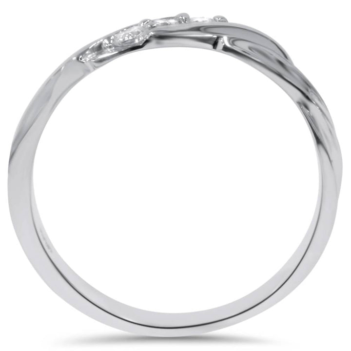 Set in solid 14k white gold with three round natural earth-mined diamonds. Diamond clarity I2-I3, color G-H.