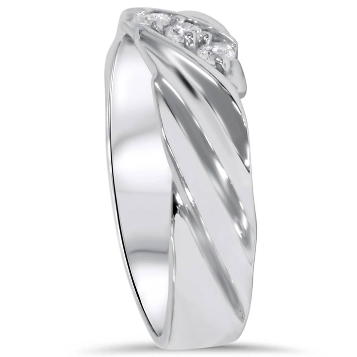 This Three Stone Diamond Wedding Ring by Pompeii3 is designed for men who appreciate understated elegance. Featuring three round diamonds prong-set in heavy 14k white gold, it makes a confident and sophisticated statement.