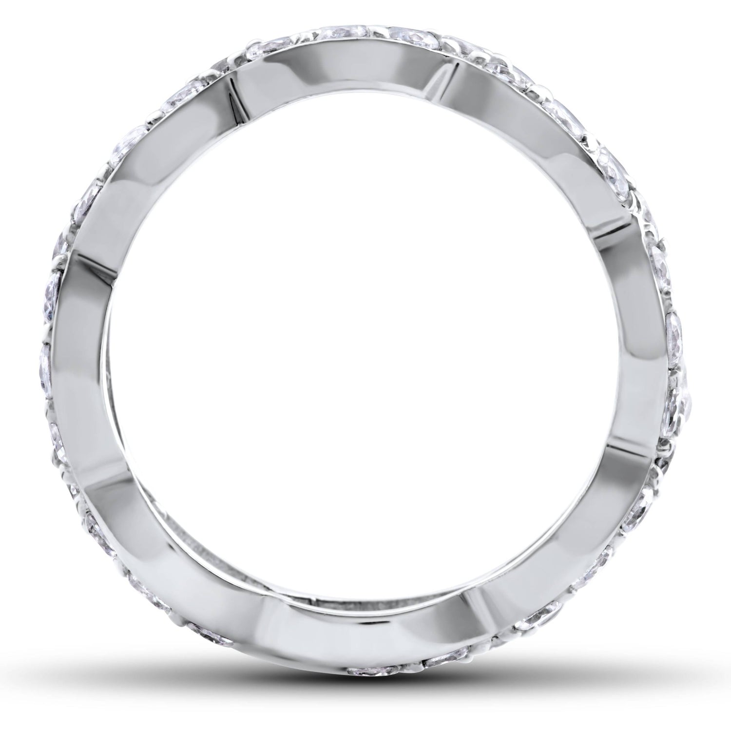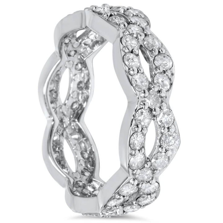This 1 cttw Diamond Infinity Eternity Ring by Pompeii3 symbolizes endless love and brilliance. Approximately 56 round cut diamonds form an intricate infinity design in polished white gold, ideal for anniversaries or special celebrations.