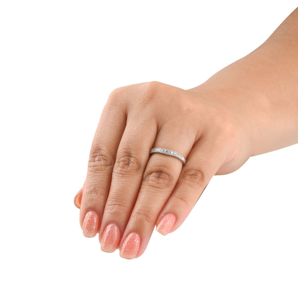 This 1/10ct Vintage Diamond Notched Wedding Ring by Pompeii3 exudes romantic charm with vintage-inspired notched detailing. Set with 11 sparkling round-cut natural diamonds, this slender band is crafted to complement and fit perfectly with engagement style ENG0219. A delicate symbol of unity and commitment that will never go out of style.
