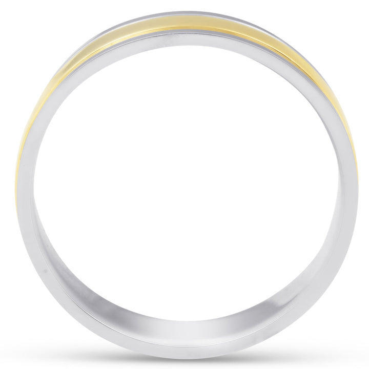 This 6mm Platinum & 18k Gold Two-Tone Wedding Band by Pompeii3 showcases sophistication and durability with a brushed platinum exterior and high-polish yellow gold edges, designed for lifelong comfort and style.