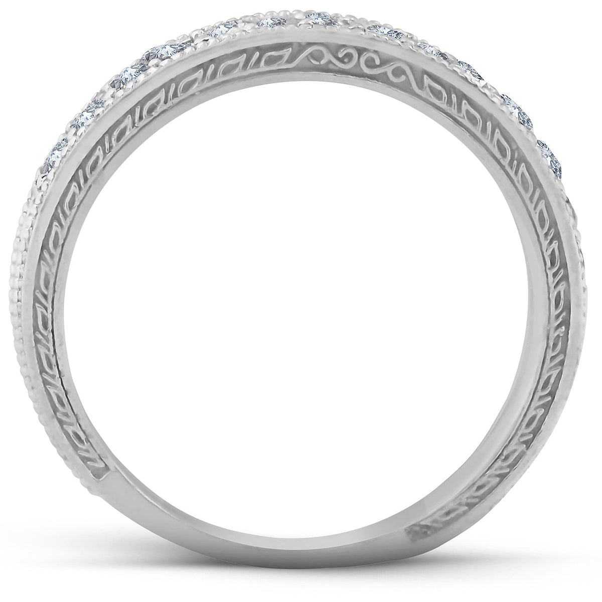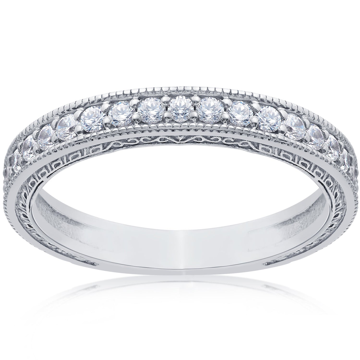 This 1/2ct Vintage Diamond Wedding Ring by Pompeii3 is adorned with hand-carved scroll details and shimmering diamonds, making it an exquisite blend of artistry and timeless romance.