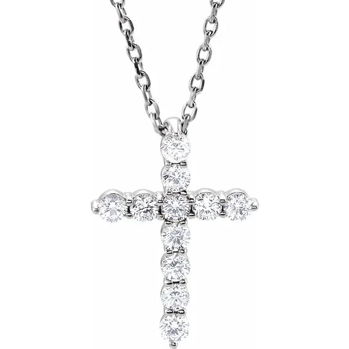 This 1/4 Ct Diamond Cross 14k White Gold Pendant Necklace by Pompeii3 is a symbol of strength and devotion, with 11 round diamonds prong set in solid 14K white gold, creating a radiant cross design.