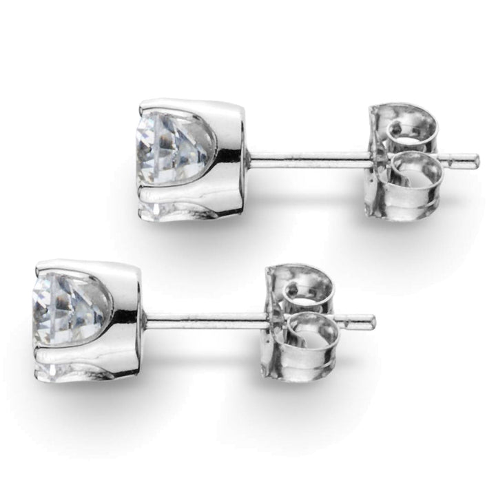 These 1 Ct TW Moissanite Studs by Pompeii3 are timeless and radiant. Each stud features a brilliant 5mm moissanite stone set in four prongs with a classic design, secured with butterfly push backs for everyday luxury.