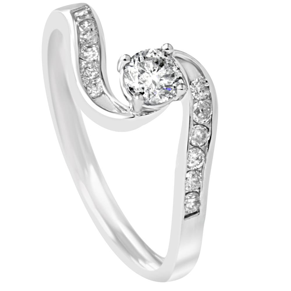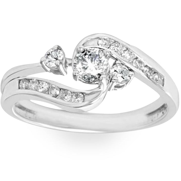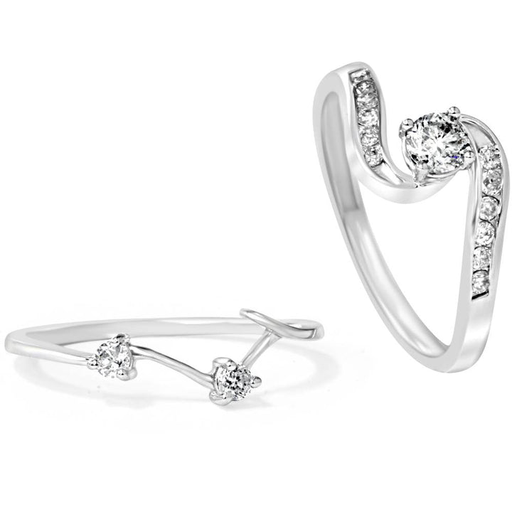 This 1/2ct Twist Diamond Engagement Wedding Ring Set by Pompeii3 combines a unique twist design with elegance. The set features a 1/4-carat center stone and 14 round-cut accent diamonds, all set in solid 14K white gold. This modern yet classic design is perfect for those looking for a distinctive engagement and wedding ring set that stands the test of time.