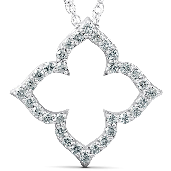 The 1/3 Ct Diamond Floral Designer Pendant by Pompeii3 is a romantic piece featuring a delicate clover shape sparkling with diamonds, making it a thoughtful gift or elegant everyday accessory.