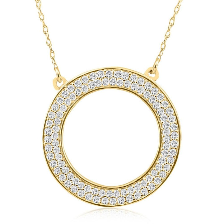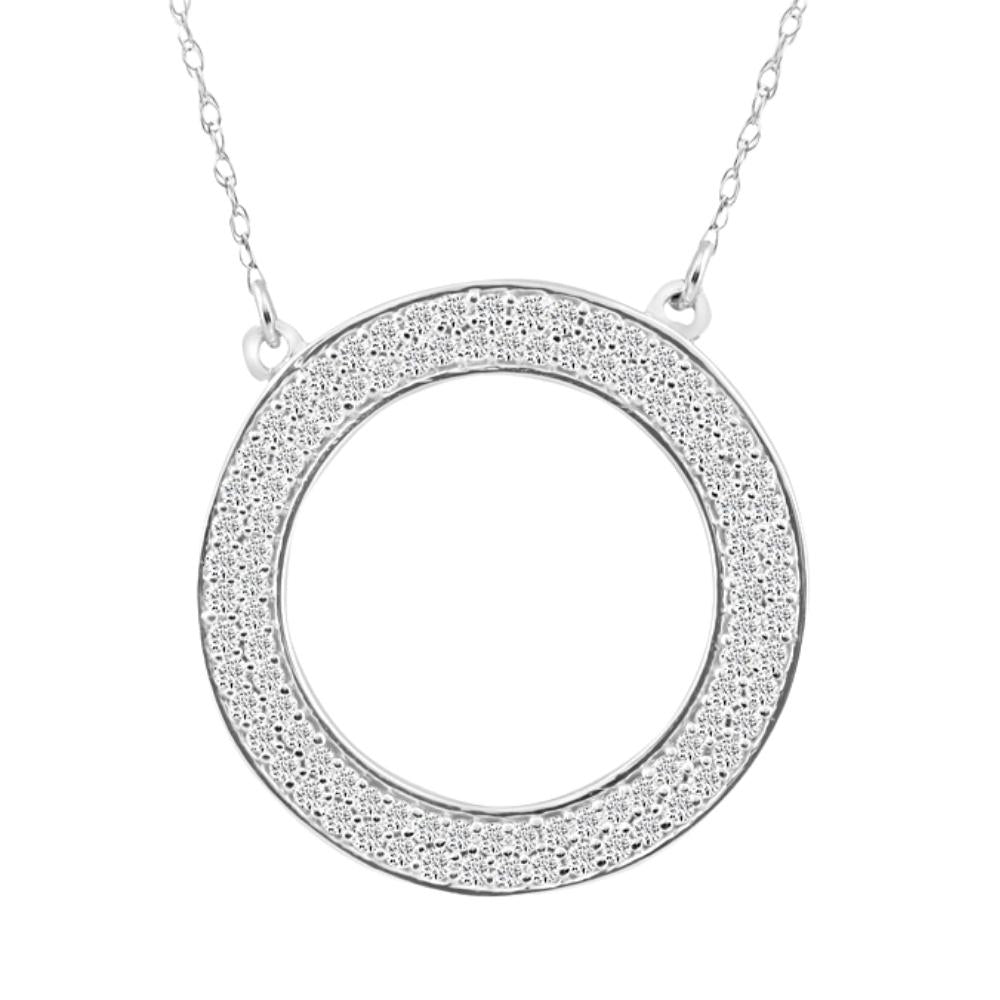This 5/8ct Pave Round Cut Diamond Circle Pendant in White or Yellow Gold Necklace by Pompeii3 features 96 round brilliant cut natural diamonds set in solid 10k gold. This fashionable and versatile piece is perfect for layering or wearing alone. Comes with an 18-inch 14k gold spring ring chain.
