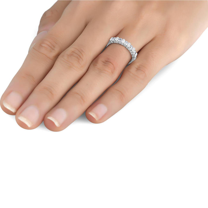 This 1/2ct 5-Stone Diamond Bar Set Wedding Ring by Pompeii3 exudes timeless elegance with five sparkling round brilliant cut diamonds set securely in a sleek bar design. A perfect bridal band that radiates classic sophistication.
