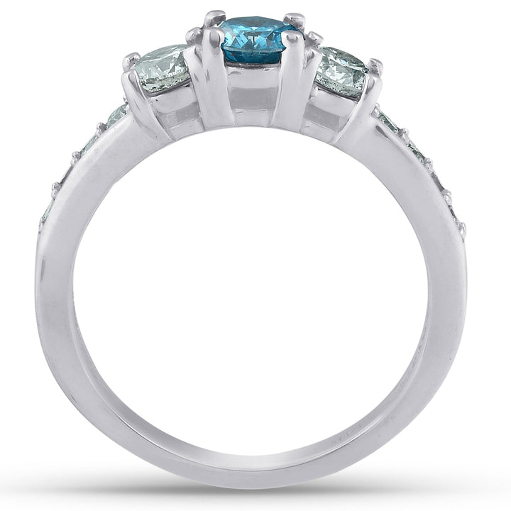 1 Carat Three Stone Blue & White Diamond Ring 14K White Gold