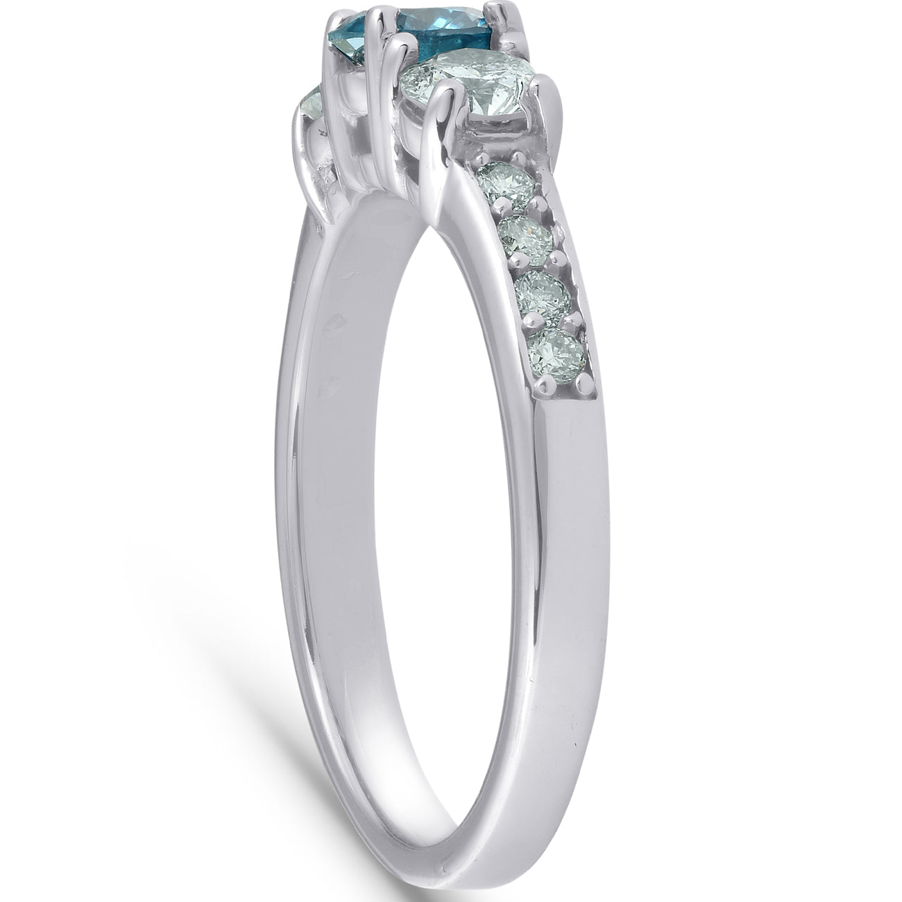 Crafted in solid 14k white gold with a total carat weight of 1ct. Features a blue center stone and white accent diamonds, all with I2-I3 clarity and H-I color.