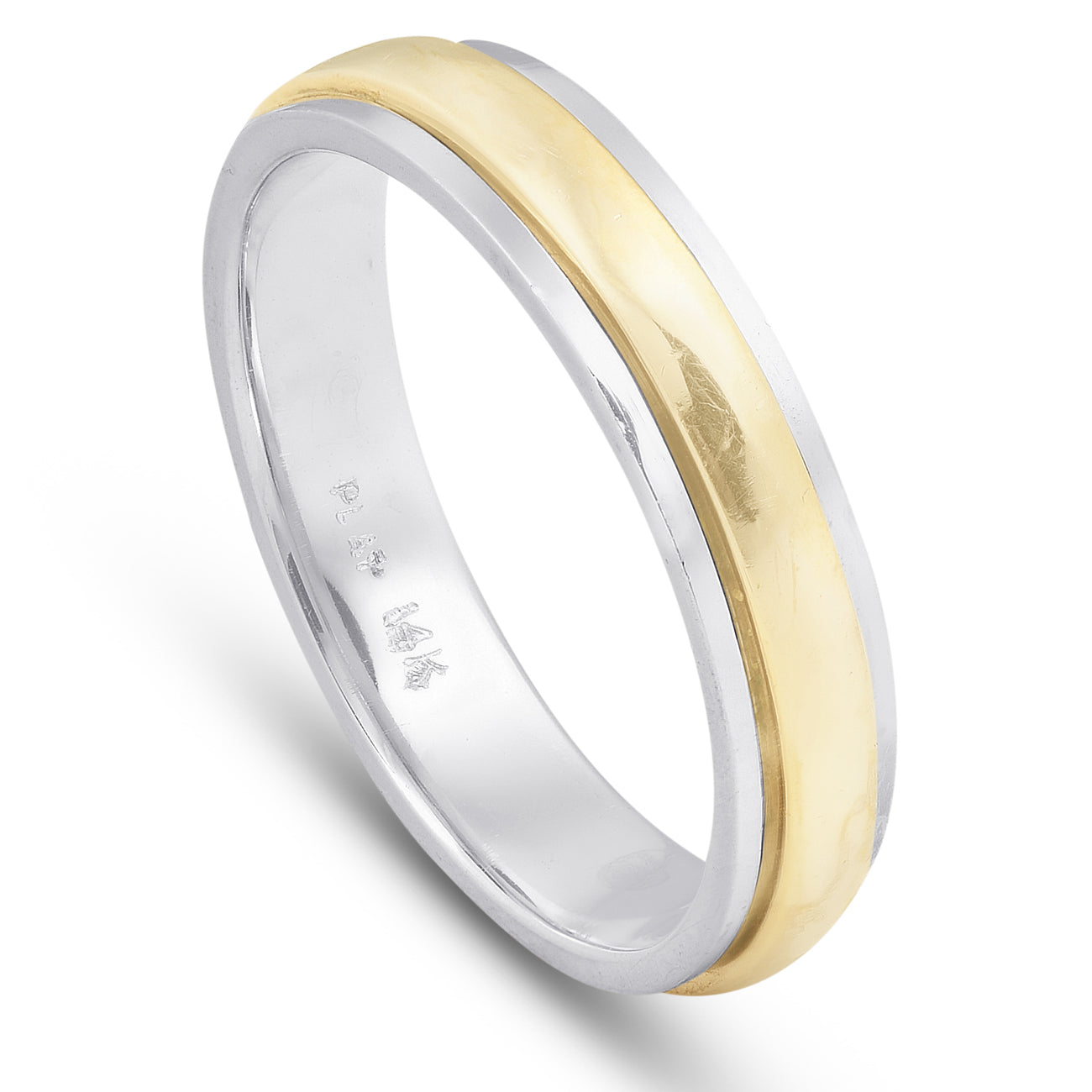 Crafted in platinum with a 14k yellow gold center, finished with a high polish and comfort-fit interior.