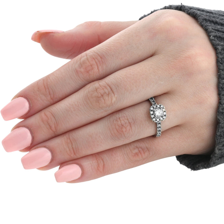 This 1ct Cushion Halo Diamond Engagement Ring by Pompeii3 radiates classic romance with its halo design. A sparkling 3/8ct center stone is surrounded by 22 shimmering accent diamonds, all set in gleaming white gold — a luxurious tribute to everlasting love.