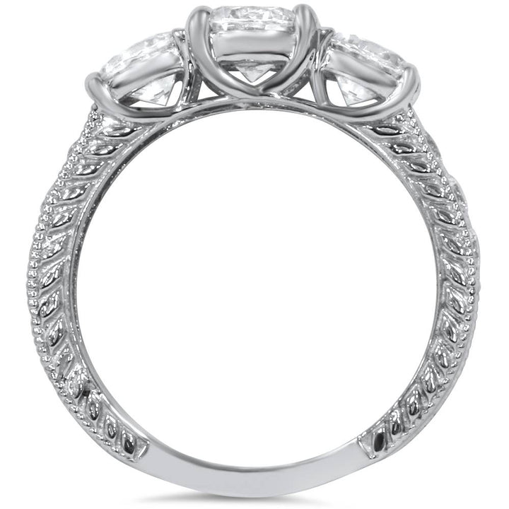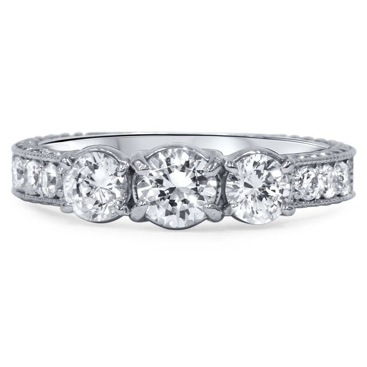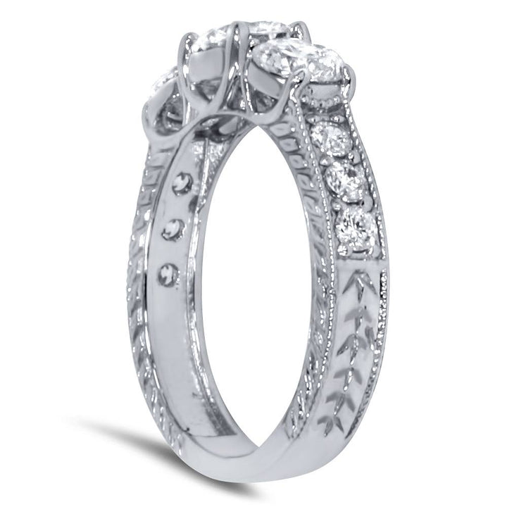 This 2ct Vintage Three Stone Round Diamond Engagement Ring by Pompeii3 brings an antique touch to your engagement with a 3/4ct center stone and two 1/2ct side stones. The ring is further enhanced by six smaller round diamonds on the shank, all set in solid 14K white gold.