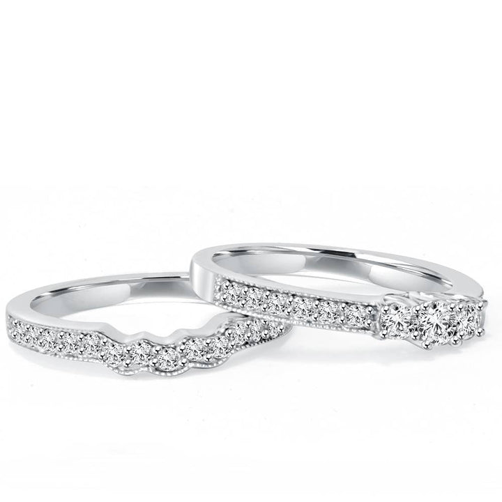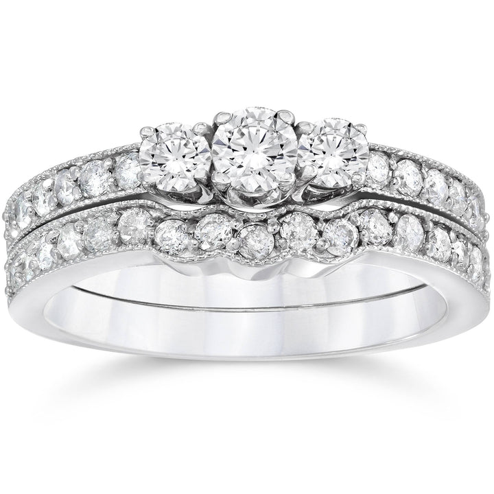 3/4 ct Three Stone Vintage Diamond Engagement Wedding Ring Set 10K White Gold