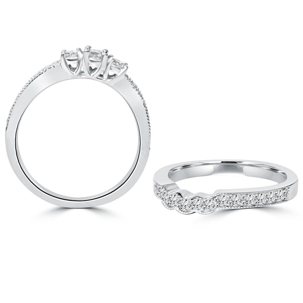 Set in 10K white gold, featuring a 3/4ct total diamond weight with natural diamonds (G-H color, I2-I3 clarity). The set includes a matching wedding band with milgrain detailing.