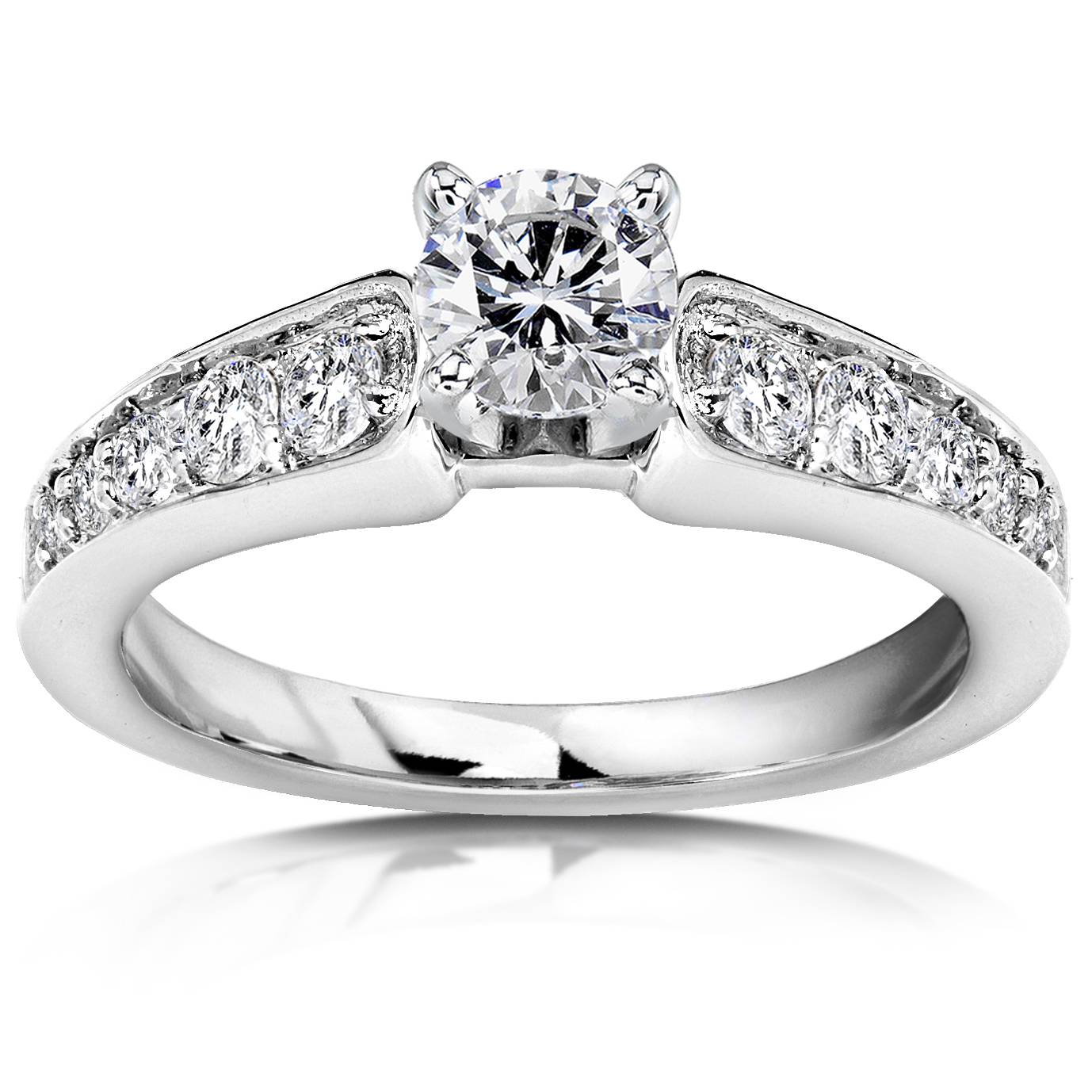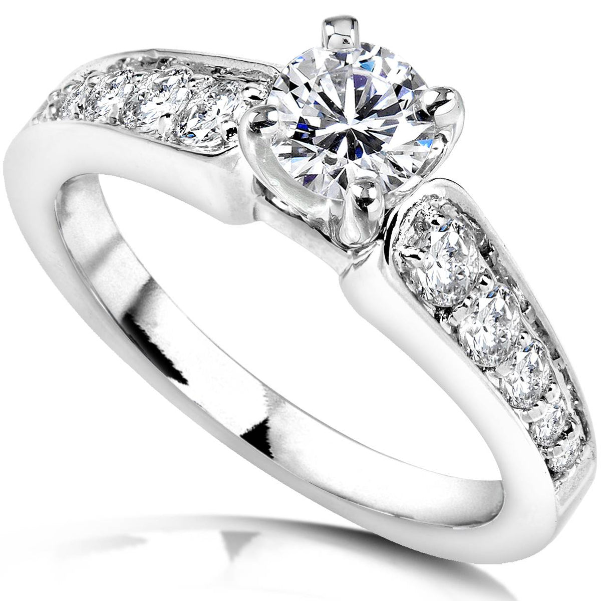 Crafted in solid 14k white gold with a 1/4 carat center diamond and ten accent diamonds totaling 3/4 carat. Diamond clarity I2-I3, color G-H.