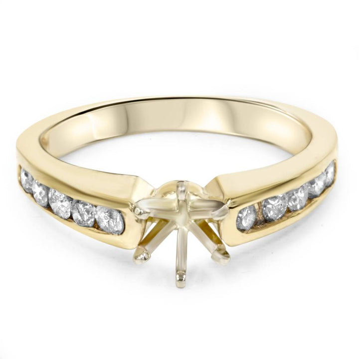 This 1/2ct Diamond Semi Mount Engagement Ring Setting by Pompeii3 is a timeless base for your custom engagement ring. Ten round brilliant cut natural diamonds are channel set in gleaming 14k yellow gold, ready to hold a center stone up to 1ct.