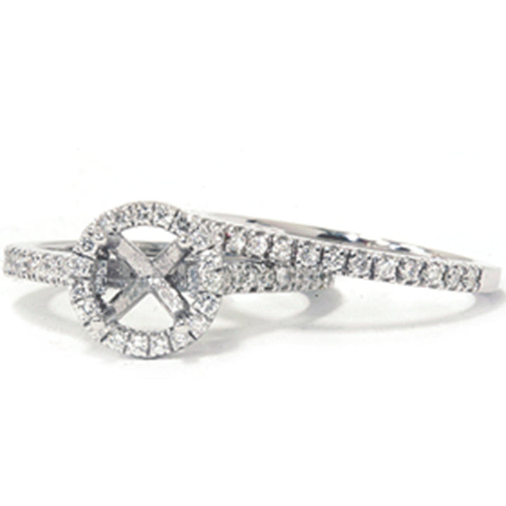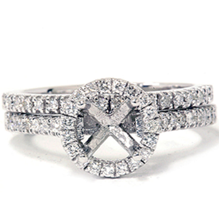 Handcrafted in 14k white gold with 57 round brilliant cut diamonds totaling 1/2ct. Diamond clarity: I2-I3, color: G-H. Accommodates .75-1.25ct round center diamond.