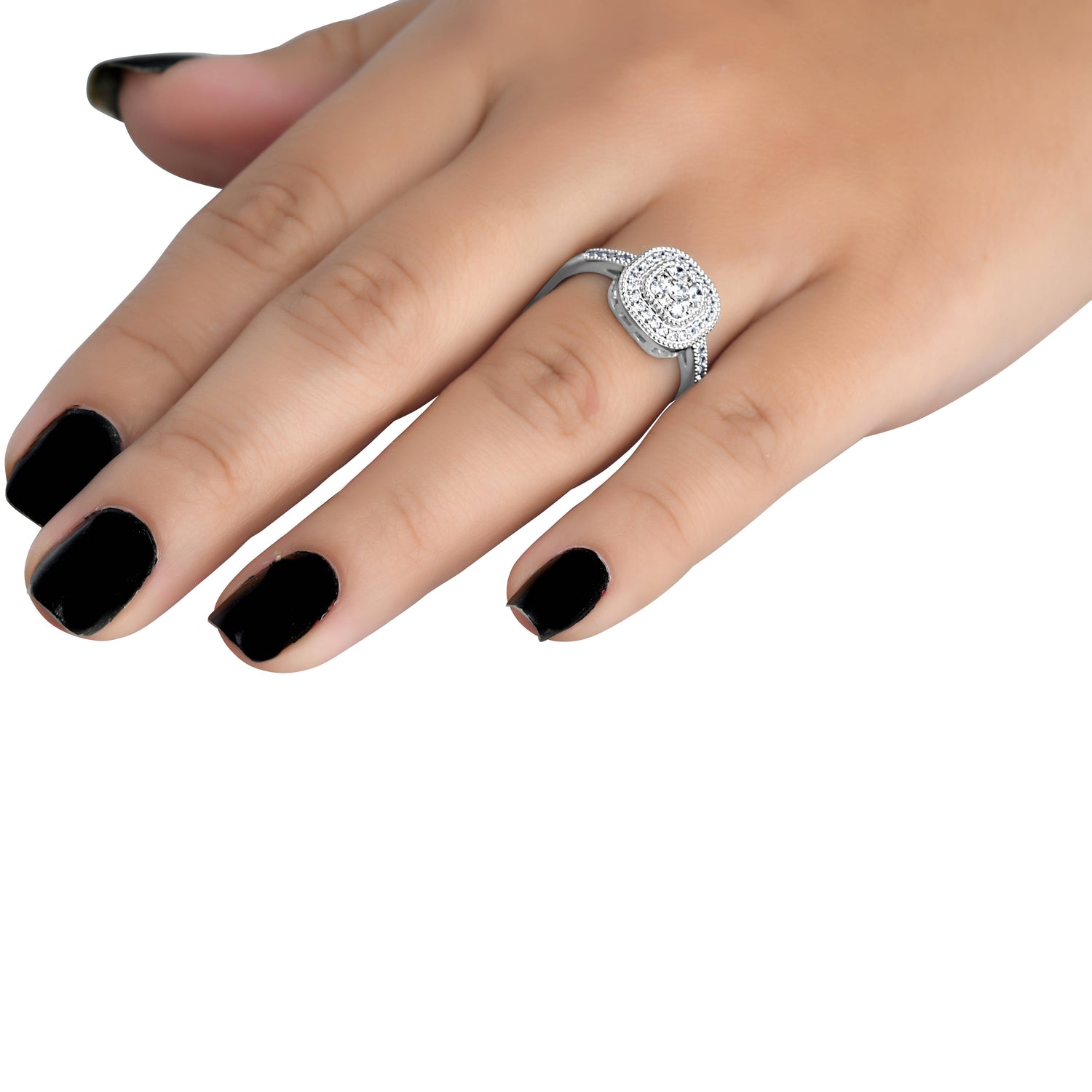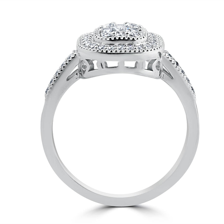 This 3/8Ct Vintage Natural Diamond Cushion Halo Shape Ring by Pompeii3 features a romantic vintage design, with round-cut natural diamonds encircling a cushion halo shape. Set in polished white gold, it’s a timeless piece perfect for elegant engagements.