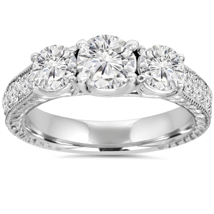 This 2ct Vintage Three Stone Round Diamond Engagement Ring by Pompeii3 showcases opulence and vintage allure. Featuring a stunning 3/4ct center diamond and two 1/2ct side stones with intricate accents, it’s the ultimate symbol of enduring romance.