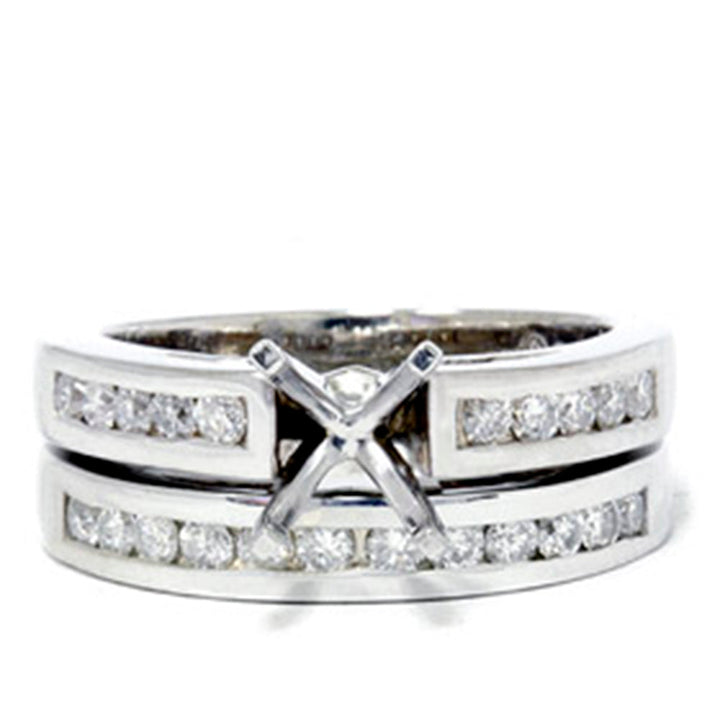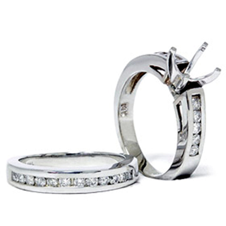 This 5/8ct Diamond Ring Setting Mounting by Pompeii3 is a classic bridal set featuring an engagement mount and matching wedding band. With 22 round brilliant cut natural diamonds channel set in gleaming 14k white gold, this set is timeless and elegant, designed to hold center stones up to 1ct.
