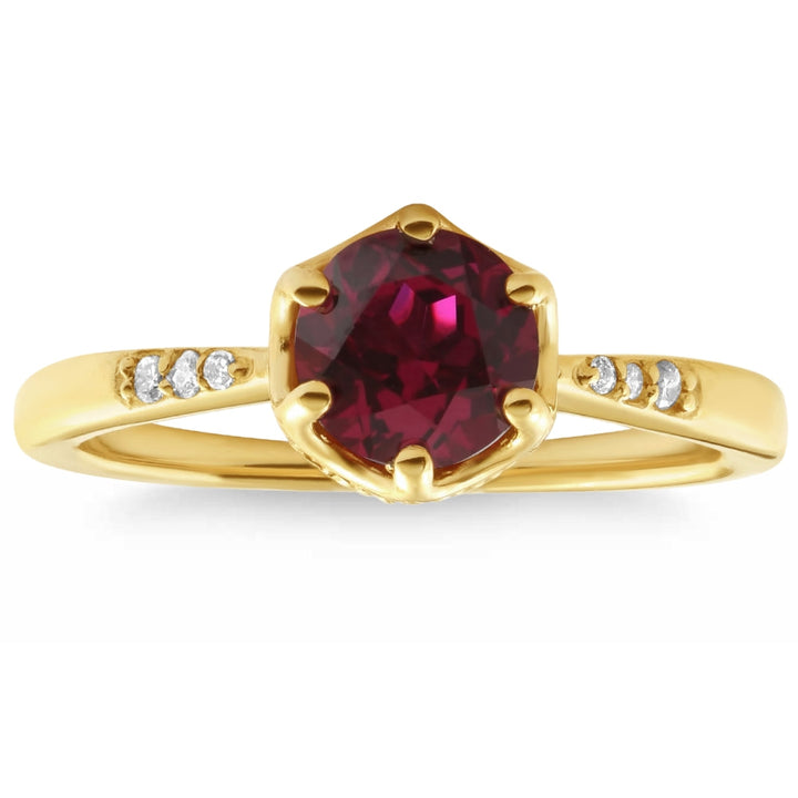 Set in solid 10K polished gold, featuring a 5mm round lab-grown ruby and round-cut lab-grown diamonds (total weight: 3/4 ct).