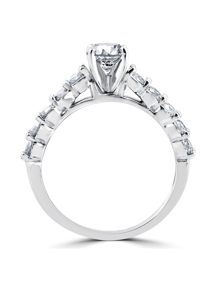 Handcrafted in solid 14k white gold with a 1/2ct round brilliant cut natural center diamond and 21 accent diamonds totaling 2 1/15 carats.