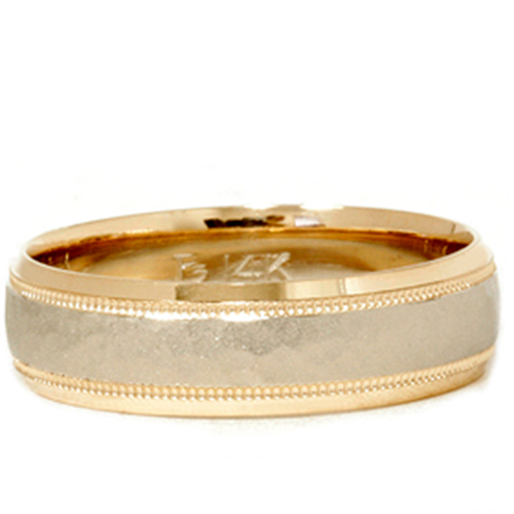 Solid 14k white and yellow gold with a 6mm width, hammered finish, and rounded comfort-fit interior.