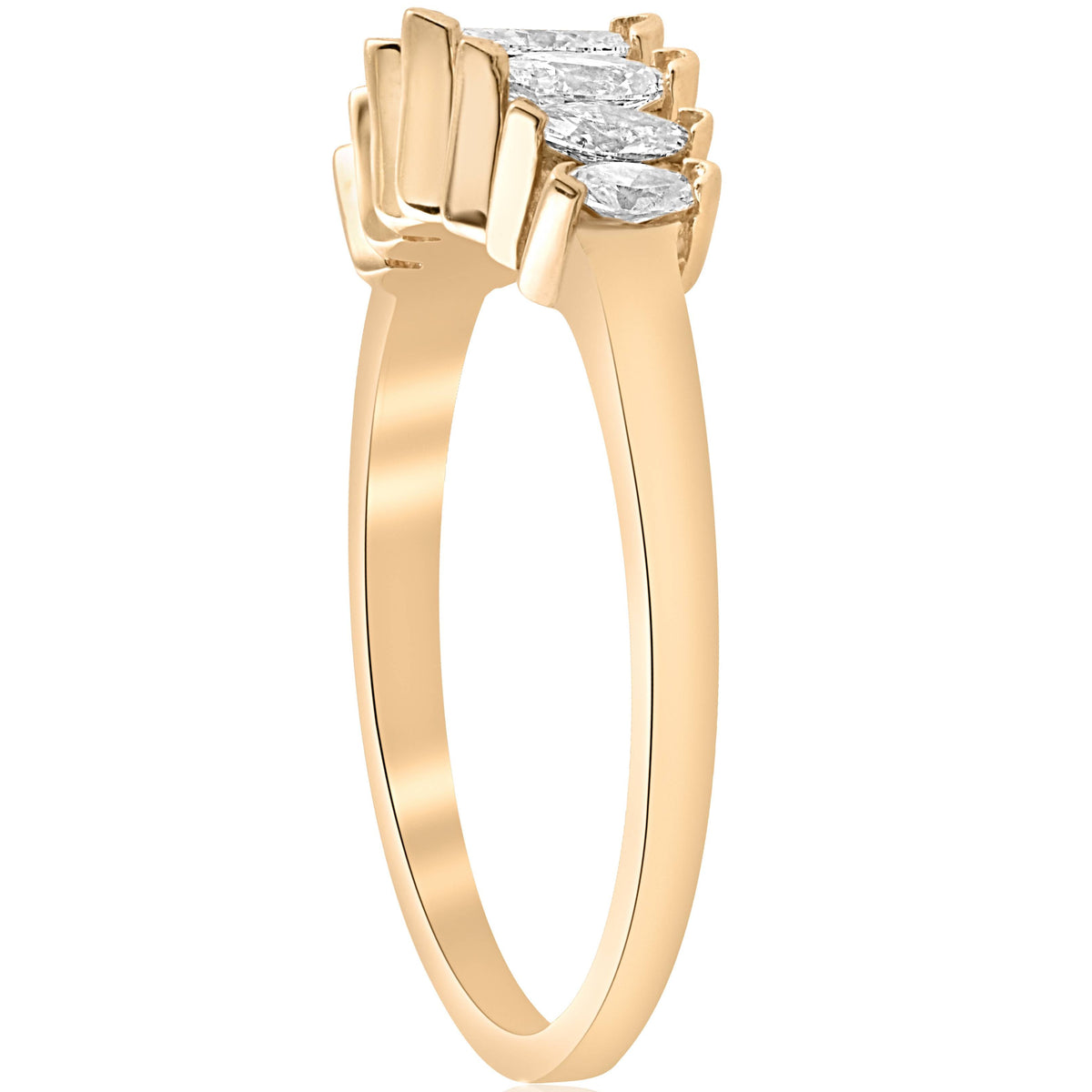 This 14k Yellow Gold 3/4ct Marquise Diamond Wedding Anniversary Ring by Pompeii3 is graceful and sophisticated. Seven graduated marquise diamonds sparkle across a polished yellow gold band, perfect for celebrating milestones or anniversaries.